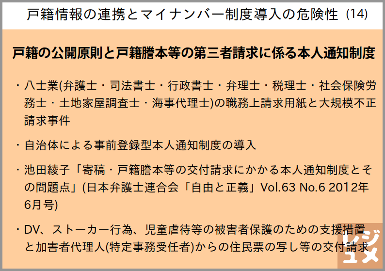 そういう点からいうと、もうマイナンバー制度自体がプライバシー・バイ・デザインに合っていない。さらに、機微情報を含んだ戸籍をマイナンバーで取り扱うということは輪をかけて問題であると言えると思います。