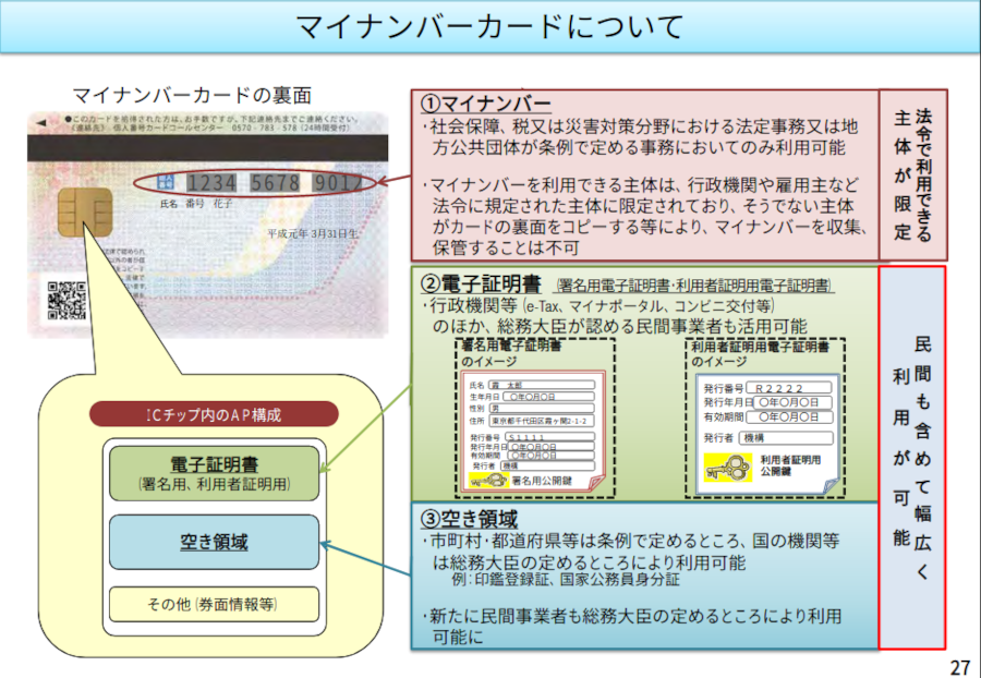 さらにマイキーIDは、マイナンバーカードに内蔵の電子証明書(JPKI)の発行番号(シリアル番号)とひも付けて管理します 18(右のスライドをクリック)。電子証明書のシリアル番号は、マイナポータルや健康保険のオンライン資格確認などさまざまな制度で、本人を識別特定するコードとして使用されるだけでなく、民間でも利用が認められています。